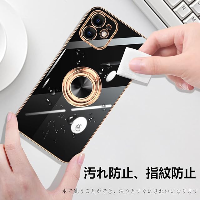 商品名:iPhone11 ケース リング付き アイフォン11 リング カバー 耐衝撃 TPU メッキ加工 360°回転 スタンド機能 車載ホルダー ストラップホール付き 6.1インチ(ブラック)