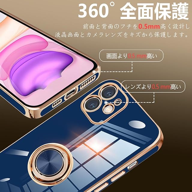 商品名:iPhone11 ケース リング付き アイフォン11 リング カバー 耐衝撃 TPU メッキ加工 360°回転 スタンド機能 車載ホルダー ストラップホール付き 6.1インチ(ブルー)