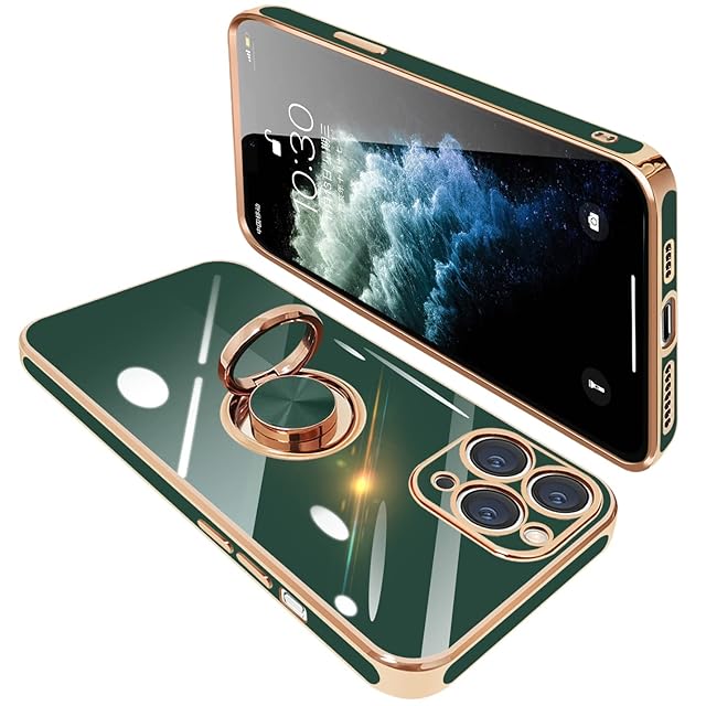 iPhone11 pro ケース リング付き アイフォン11pro リング カバー 耐衝撃 TPU メッキ加工 360°回転 スタンド機能 車載ホルダー ストラップホール付き 5.8インチ(ダークグリーン)