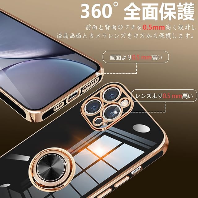 iPhone12 Mini ケース リング付き アイフォン12Mini リング カバー 耐衝撃 TPU メッキ加工 360°回転 スタンド機能 車載ホルダー ストラップホール付き 5.4インチ(ブラック)