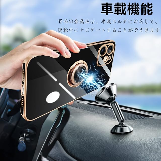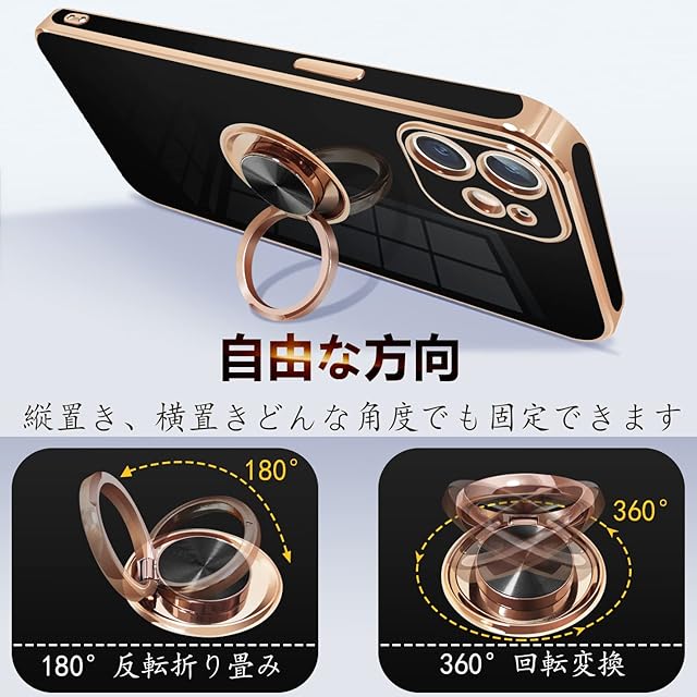 商品名:iPhone12 Mini ケース リング付き アイフォン12Mini リング カバー 耐衝撃 TPU メッキ加工 360°回転 スタンド機能 車載ホルダー ストラップホール付き 5.4インチ(ブラック)