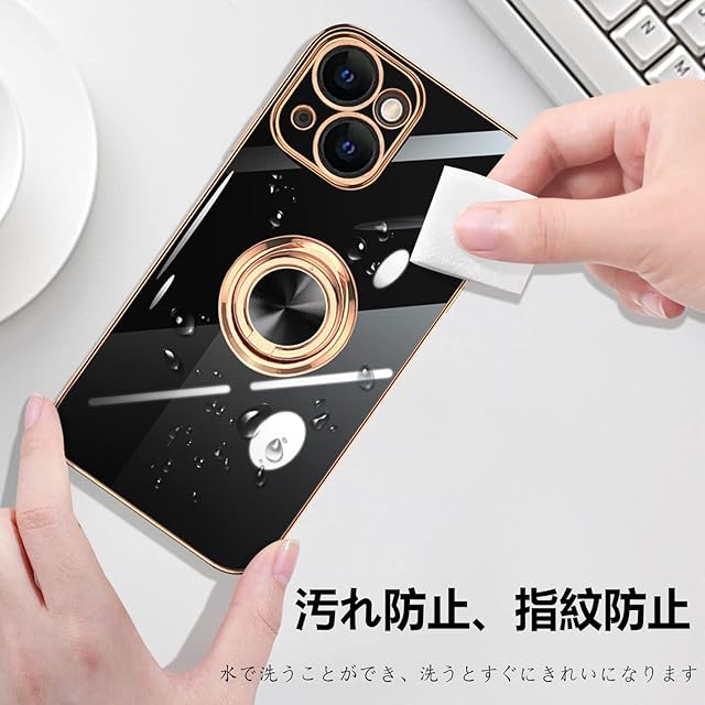 商品名:iPhone13 Mini ケース リング付き アイフォン13Mini リング カバー 耐衝撃 TPU メッキ加工 360°回転 スタンド機能 車載ホルダー ストラップホール付き 5.4インチ(ブラック)