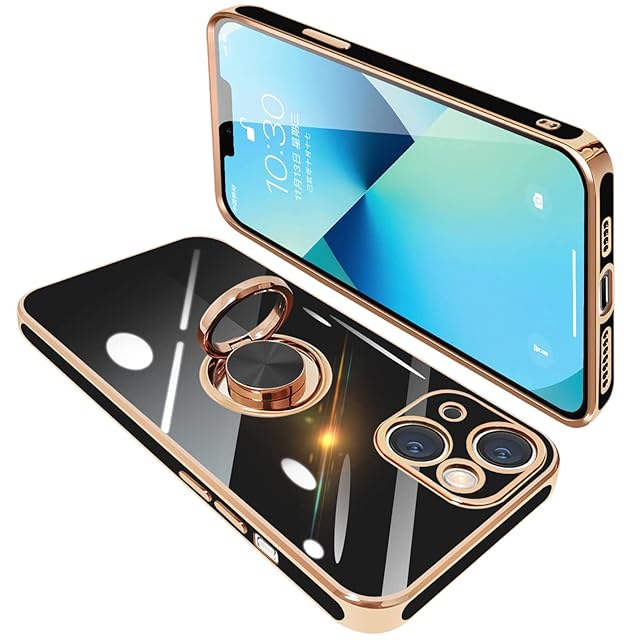 iPhone13 Mini ケース リング付き アイフォン13Mini リング カバー 耐衝撃 TPU メッキ加工 360°回転 スタンド機能 車載ホルダー ストラップホール付き 5.4インチ(ブラック)