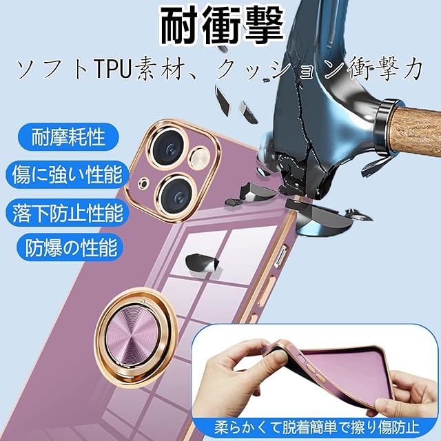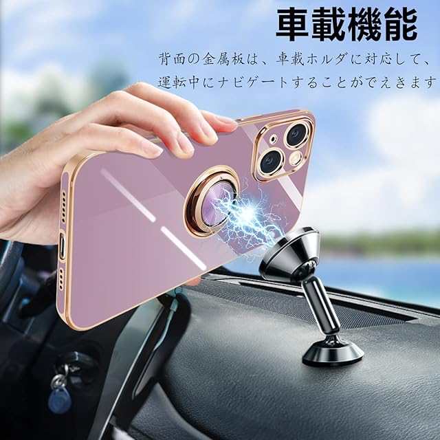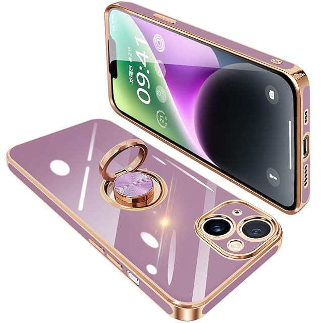商品名:アイフォン14 ケース リング付き アイフォン14 リング カバー 耐衝撃 TPU 360°回転 スタンド機能 メッキ加工 車載ホルダー ストラップホール付き 6.1インチ(パープル)