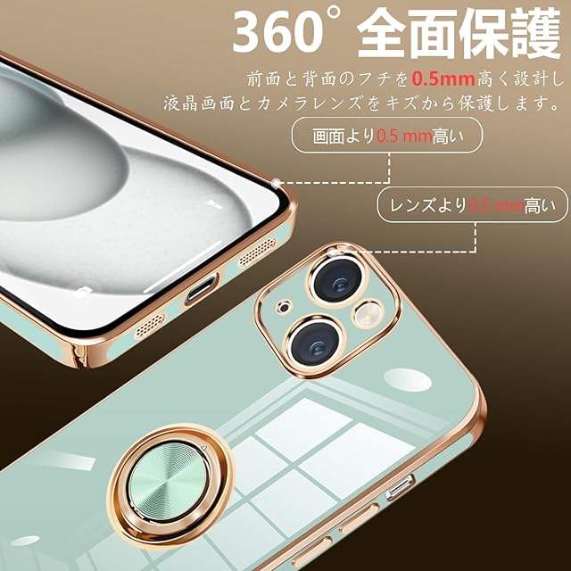 iPhone15 Plus ケース リング付き アイフォン15Plus リング カバー 耐衝撃 TPU 360°回転 スタンド機能 メッキ加工 車載ホルダー ストラップホール付き 6.7インチ(ライトシアン)