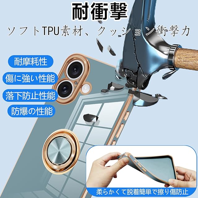 ONETIAOLONG iPhone17 用の ケース リング付き アイフォン17 用の リング カバー 耐衝撃 TPU 360°回転 スタンド機能 メッキ加工 車載ホルダー ストラップホール付き 6.3インチ(グレーブルー)