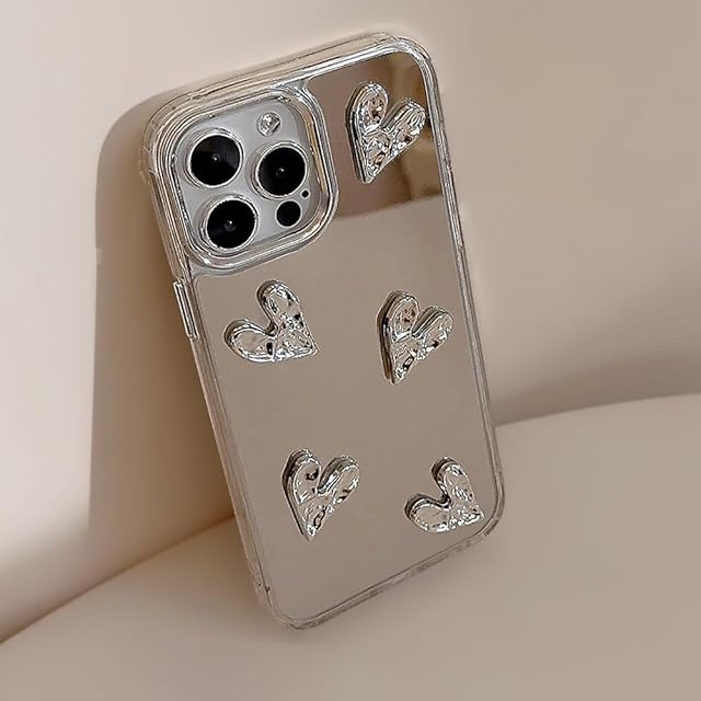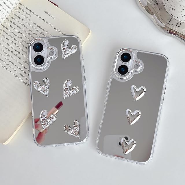 ZTOFERA iPhone 16ケース用、かわいい3Dハートミラーガールズ女性メイク電話カバー 、シルバーハート型透明iPhone 16スマホケース用、5つの心