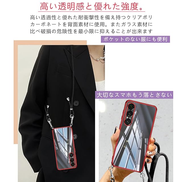 Xperia 1 VII 用の ケース ショルダー クリア 透明 xperia1vii SO-51F SOG15 スマホケース カバー 薄型 TPU 肩掛け 首掛け 斜めかけケース 耐衝撃 エクスペリア1VII(レッド)