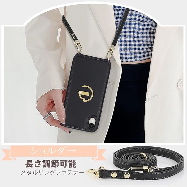 Havaya スマホショルダー iPhone xr ケース iphonexr ケース スマホケースiphone10R ショルダー リング付き レザー 肩掛け カード収納(アイフォン XR/あいふぉんxr/いphone xr/アイホン10r 6.1インチ対応)-ブラック