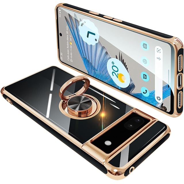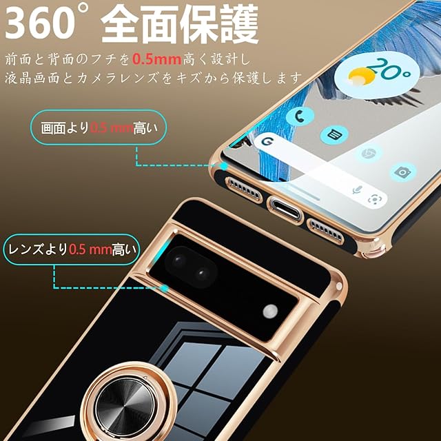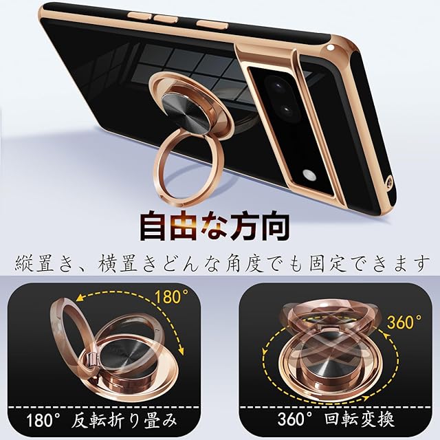 商品名:Google Pixel7A ケース リング付き グーグル ピクセル 7A リング カバー 耐衝撃 TPU メッキ加工 360°回転 スタンド機能 車載ホルダー ストラップホール付き(ブラック)