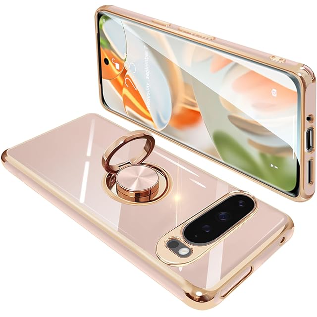 Google Pixel9 Pro XL ケース リング付き グーグル ピクセル 9ProXL リング カバー 耐衝撃 TPU メッキ加工 360°回転 スタンド機能 車載ホルダー ストラップホール付き(ピンク)