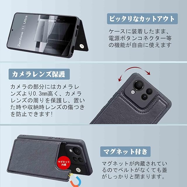 商品名:【Aqier】For ASUS Zenfone 11 Ultra 5G 用 ケース 背面手帳型 軽い薄い 純色 レザーケース (ブラック) ゼンフォン11ウルトラ ケースカード入れ 片手操作 バックカバー zenfone11u 黒