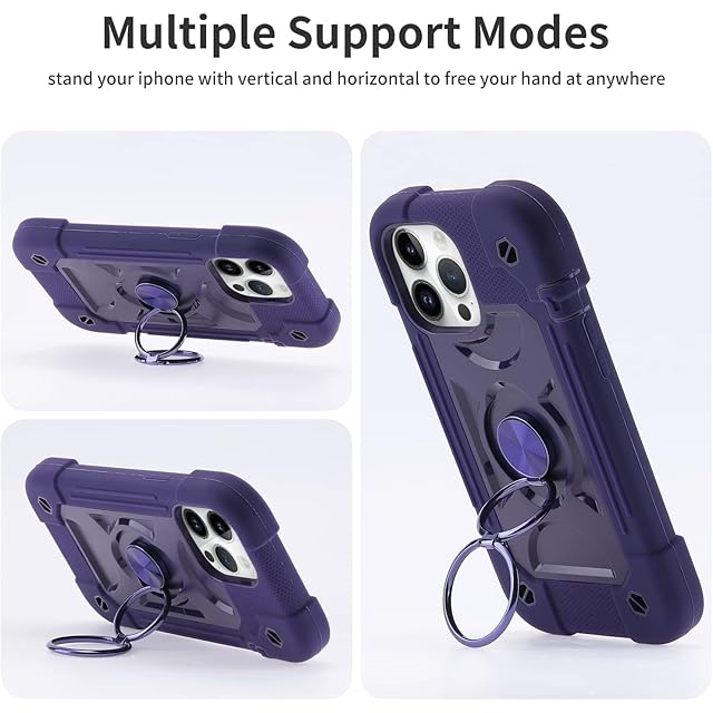 iPhone 14 Pro ケース 耐衝撃 頑丈 360度回転スタンド リング付き付き 虹色 かわいい アイフォン14 プロ ケース 車載ホルダー対応 落下防止 ストラップホール付き アウトドア 子供 仕事用 (iPhone 14 Pro, 紫)