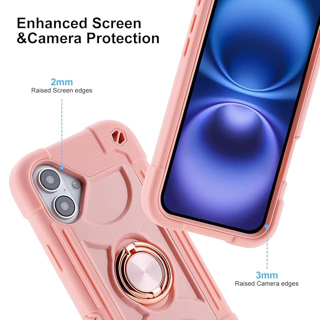 PboyiqiS For iPhone 16 ケース 耐衝撃 頑丈 360度回転スタンド リング付き付き 虹色 かわいい アイフォン16 マックス ケース 車載ホルダー対応 落下防止 ストラップホール付き アウトドア 子供 仕事用 (ピンク, iPhone 16)