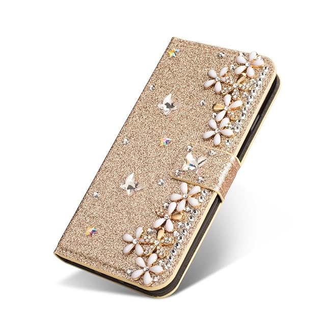 OYIME iphone 13 / iphone 14 用 ケース 手帳型 おしゃれ お花 蝶々 デザイン かわいい きらきら デコ 女子 女性向け きれい 優雅 カバー 横開き マグネット カード収納 耐衝撃 滑り防止 スマホケース ハンドメイド アィフォン 13/14 手帳型ケース PUレザー 携帯カバー (ゴールド)
