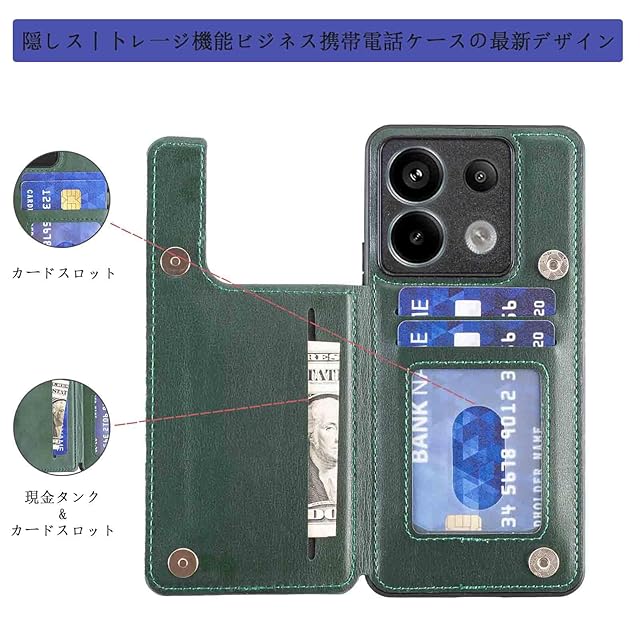 【Aqier】カバー 用 Redmi Note 13 Pro 5G ケースカード(ダルグリーン)シャオミ レッドミー13プロ 5g スマホケース 背面カード 収納 軽量 多機能 ケース 手帳型 シャオミnote13pro GREEN