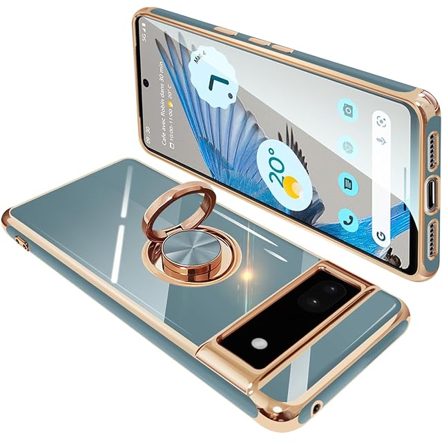 商品名:Google Pixel7A ケース リング付き グーグル ピクセル 7A リング カバー 耐衝撃 TPU メッキ加工 360°回転 スタンド機能 車載ホルダー ストラップホール付き(グレーブルー)