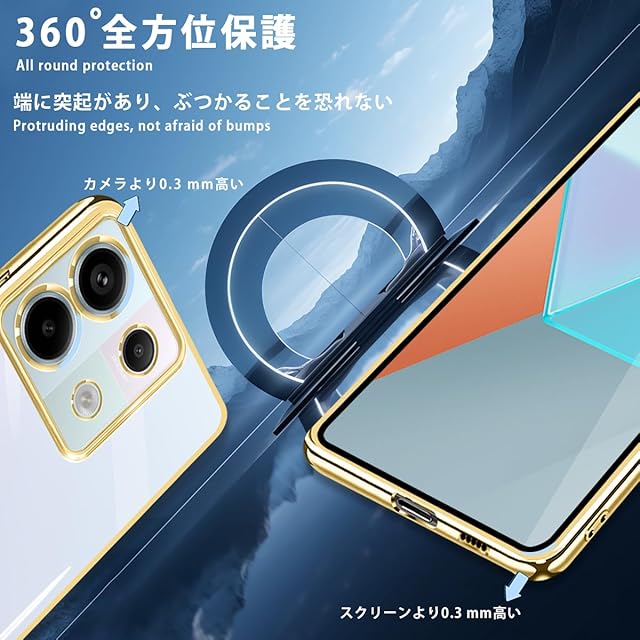 【透明感&メッキ加工】透明的な背面がRedmi Note 13 Pro 5Gの本来の美しさを引き出し、メッキ加工されたフレームはさらにスタイリッシュな印象を与えます。背面がクリアなので好きなシールや写真を入れてカスタマイズOK。