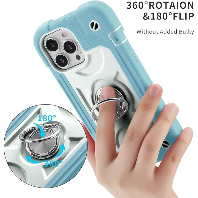 iPhone 13 Pro Max ケース 耐衝撃 頑丈 360度回転スタンド リング付き付き 虹色 かわいい アイフォン13 プロ マックス ケース 車載ホルダー対応 落下防止 ストラップホール付き アウトドア 子供 仕事用 (iPhone 13 Pro Max, 薄ブルー)