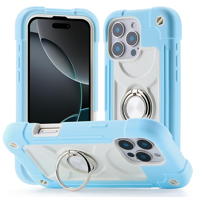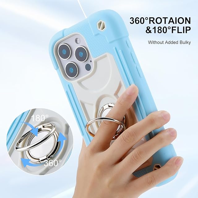 PboyiqiS For iPhone 16 Pro ケース 耐衝撃 頑丈 360度回転スタンド リング付き付き 虹色 かわいい アイフォン16 プロ ケース 車載ホルダー対応 落下防止 ストラップホール付き アウトドア 子供 仕事用 (薄ブルー, iPhone 16 Pro)