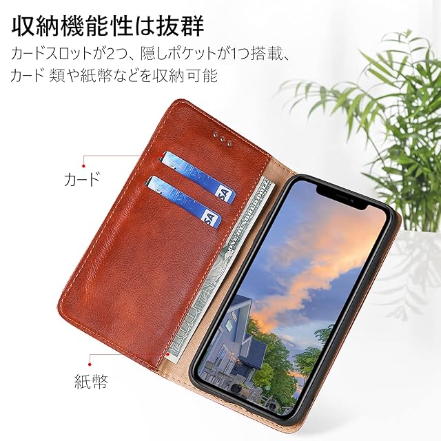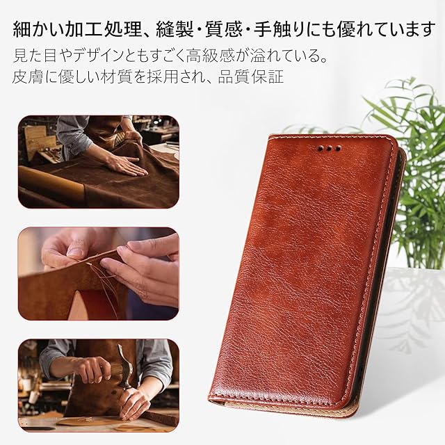 シンプルでスタイリッシュなデザインを採用し、あなたの携帯電話をより洗練されたものにしてくれます。高級感が溢れてどんな場所でも自由に使えます。最大5つ色を選べられる。 は革の風合いを求めて、上質合皮を採用しています。製の精密で、質感、強さ、キャラクターなどが厳選されています、長く愛用していただけますよ。色合い、光沢感、質感、肌触りなどから見て、本革に迫ると言えます、長時間使っても、手に汗が出てもケースは変なにおいが出てきません。 ケース本体を嵌めるプラスチック部分は耐久性と弾力性に富むTPU素材を採用します。割れることはなく、衝撃から本体をしっかり保護します。