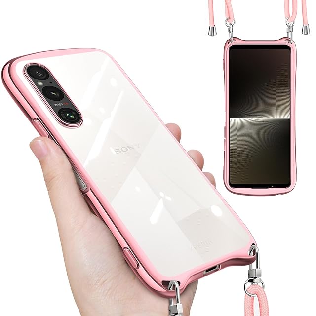 Sony Xperia 1 V ケース クリア ショルダー ストラップ付き SO-51D SOG10 カバー 透明 肩掛け 斜めかけ TPU シリコン メッキ加工 耐衝撃 全面保護 薄型 韓国 可愛い 縄掛け エクスペリア 1V スマホケース (ローズゴールド)