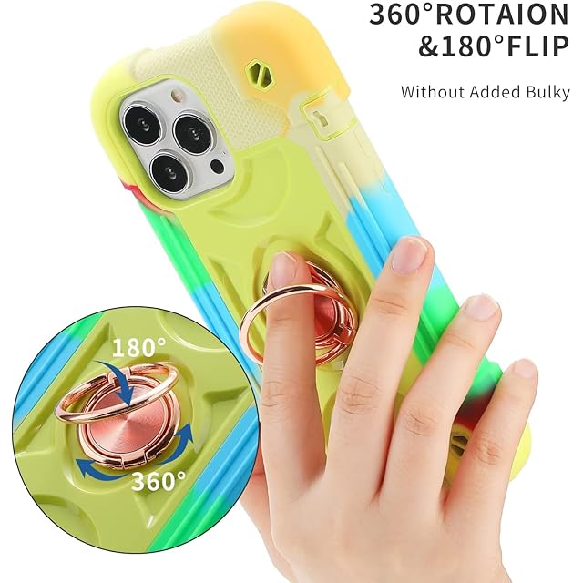 商品名:iPhone 14 / iPhone 13 用 ケース 耐衝撃 頑丈 360度回転スタンド リング付き付き 虹色 かわいい アイフォン14 ケース 車載ホルダー対応 落下防止 ストラップホール付き アウトドア 子供 仕事用 あいふぉん 13 アイフォン 14 (6.1インチ) 対応 (iPhone 14 / iPhone 13, 虹色黄)