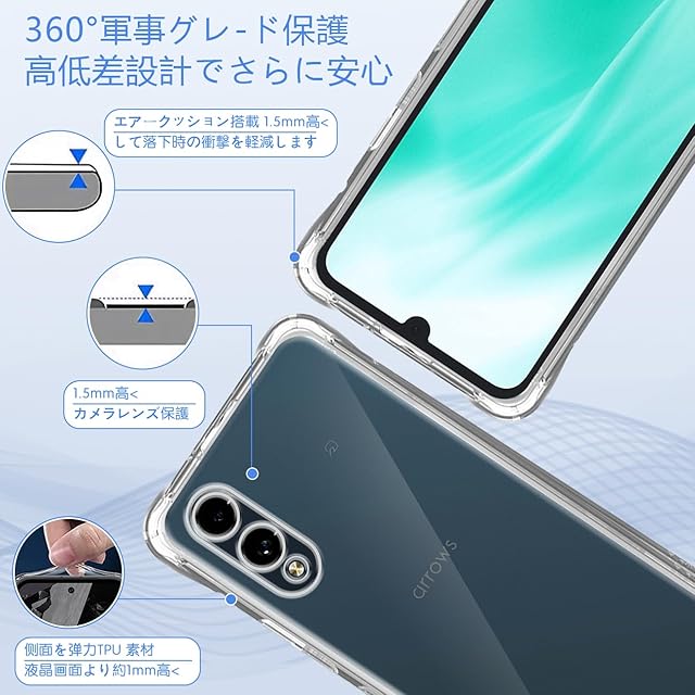 スマホが日常の生活に溶け込む現代で、落下などによるスマホの破損は販売台数に比例して増えている状況です。<br>本ケースの角には落下時の衝撃を吸収するエアポケットを備えており、万が一スマホを落としてしまった場合でも、落下時のダメージを最小限に抑えることが可能となっており、<br>その耐衝撃性能は第三者機関の試験による米軍MIL規格をクリアするほど高いことが証明されております。<br>また、アローズ We2 専用にオリジナル設計しているためぴったりとフィットし、保護性能には欠かせないポイントとなっています。 <br><b>【高設計】</b> <br>対応 Arrows We2 本体にぴったりフィイットするよう設計し、精巧をきわめていることの孔位で。<br> 着脱も簡単で、スマホ本体への擦り傷も心配無用です。内側のマイクロファイバーライニングクロスは非常に柔らかく、電話の裏面を傷つけません。 <br><b>【高品質】</b> <br>高品質のTPU素材を採用して、磨耗に耐え、滑り止め防塵、分裂防止などの全面の保護を提供します。<br>落ちることでもたらす衝撃力を吸収できるから、壊されないケースである。 <br><b>【高い透明度】</b> <br>背面に高透明度と指紋軽減を両立した特殊TPU素材を採用、透明背面は黄ばまず。透明度が高く、本体の鮮やかな色をそのまま映し出すことができ、 スマートフォン のオリジナルのカラーを損ねません。<br>驚きほどの透明感、美しさをしっかりキープ、携帯電話本体のカラーを活かせて、背面がクリアなので好きなシールや写真を入れてカスタマイズOK、本体の美しさを引き立たせて。 <br><b>【100%安心な】</b> <br>弊社は安心交換が付きます。品物はお客様の手元に届いたら、割れたり、傷など付いていたり、<br>または通常使用で問題があると思われる場合は弊社とご連絡ください。迅速に対応し、満足のいく回答をいたします。