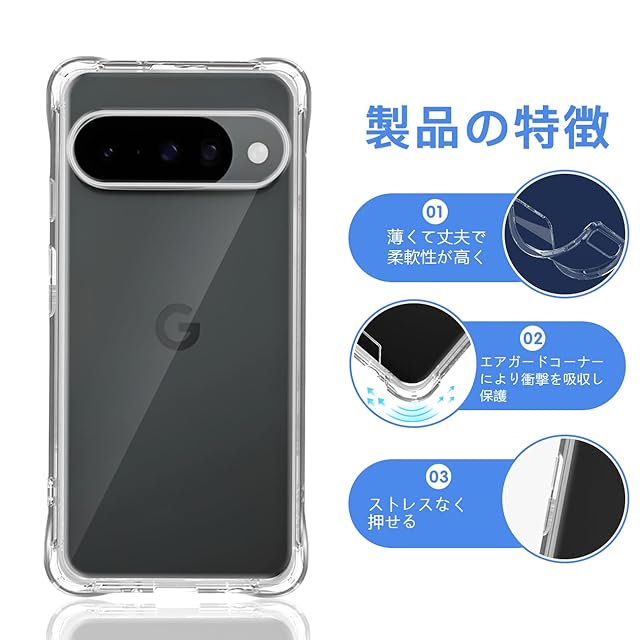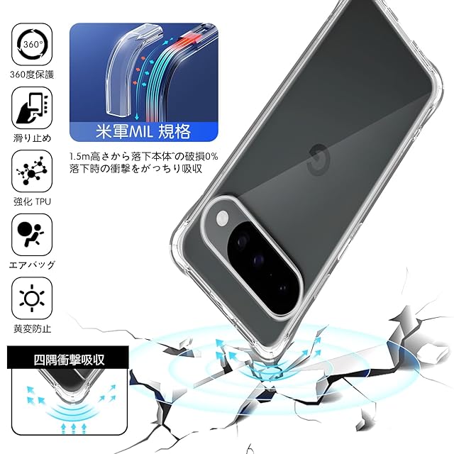 スマホが日常の生活に溶け込む現代で、落下などによるスマホの破損は販売台数に比例して増えている状況です。<br>本ケースの角には落下時の衝撃を吸収するエアポケットを備えており、万が一スマホを落としてしまった場合でも、落下時のダメージを最小限に抑えることが可能となっており、<br>その耐衝撃性能は第三者機関の試験による米軍MIL規格をクリアするほど高いことが証明されております。<br>また、ピクセル10 / ピクセル10 pro 専用にオリジナル設計しているためぴったりとフィットし、保護性能には欠かせないポイントとなっています。 <br><b>【高設計】</b> <br>対応 Pixel 10 / Pixel 10 pro 本体にぴったりフィイットするよう設計し、精巧をきわめていることの孔位で。<br> 着脱も簡単で、スマホ本体への擦り傷も心配無用です。内側のマイクロファイバーライニングクロスは非常に柔らかく、電話の裏面を傷つけません。 <br><b>【高品質】</b> <br>高品質のTPU素材を採用して、磨耗に耐え、滑り止め防塵、分裂防止などの全面の保護を提供します。<br>落ちることでもたらす衝撃力を吸収できるから、壊されないケースである。 <br><b>【高い透明度】</b> <br>背面に高透明度と指紋軽減を両立した特殊TPU素材を採用、透明背面は黄ばまず。透明度が高く、本体の鮮やかな色をそのまま映し出すことができ、 スマートフォン のオリジナルのカラーを損ねません。<br>驚きほどの透明感、美しさをしっかりキープ、携帯電話本体のカラーを活かせて、背面がクリアなので好きなシールや写真を入れてカスタマイズOK、本体の美しさを引き立たせて。 <br><b>【100%安心な】</b> <br>弊社は安心交換が付きます。品物はお客様の手元に届いたら、割れたり、傷など付いていたり、<br>または通常使用で問題があると思われる場合は弊社とご連絡ください。迅速に対応し、満足のいく回答をいたします。