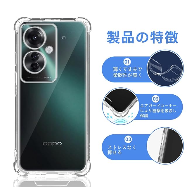 スマホが日常の生活に溶け込む現代で、落下などによるスマホの破損は販売台数に比例して増えている状況です。<br>本ケースの角には落下時の衝撃を吸収するエアポケットを備えており、万が一スマホを落としてしまった場合でも、落下時のダメージを最小限に抑えることが可能となっており、<br>その耐衝撃性能は第三者機関の試験による米軍MIL規格をクリアするほど高いことが証明されております。<br>また、OPPO Reno 11 A 専用にオリジナル設計しているためぴったりとフィットし、保護性能には欠かせないポイントとなっています。 <br><b>【高設計】</b> <br>対応 OPPO Reno 11A 本体にぴったりフィイットするよう設計し、精巧をきわめていることの孔位で。<br> 着脱も簡単で、スマホ本体への擦り傷も心配無用です。内側のマイクロファイバーライニングクロスは非常に柔らかく、電話の裏面を傷つけません。 <br><b>【高品質】</b> <br>高品質のTPU素材を採用して、磨耗に耐え、滑り止め防塵、分裂防止などの全面の保護を提供します。<br>落ちることでもたらす衝撃力を吸収できるから、壊されないケースである。 <br><b>【高い透明度】</b> <br>背面に高透明度と指紋軽減を両立した特殊TPU素材を採用、透明背面は黄ばまず。透明度が高く、本体の鮮やかな色をそのまま映し出すことができ、 スマートフォン のオリジナルのカラーを損ねません。<br>驚きほどの透明感、美しさをしっかりキープ、携帯電話本体のカラーを活かせて、背面がクリアなので好きなシールや写真を入れてカスタマイズOK、本体の美しさを引き立たせて。 <br><b>【100%安心な】</b> <br>弊社は安心交換が付きます。品物はお客様の手元に届いたら、割れたり、傷など付いていたり、<br>または通常使用で問題があると思われる場合は弊社とご連絡ください。迅速に対応し、満足のいく回答をいたします。