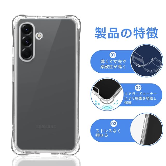 スマホが日常の生活に溶け込む現代で、落下などによるスマホの破損は販売台数に比例して増えている状況です。<br>本ケースの角には落下時の衝撃を吸収するエアポケットを備えており、万が一スマホを落としてしまった場合でも、落下時のダメージを最小限に抑えることが可能となっており、<br>その耐衝撃性能は第三者機関の試験による米軍MIL規格をクリアするほど高いことが証明されております。<br>また、ギャラクシーa56 専用にオリジナル設計しているためぴったりとフィットし、保護性能には欠かせないポイントとなっています。 <br><b>【高設計】</b> <br>対応 Galaxy A56 本体にぴったりフィイットするよう設計し、精巧をきわめていることの孔位で。<br> 着脱も簡単で、スマホ本体への擦り傷も心配無用です。内側のマイクロファイバーライニングクロスは非常に柔らかく、電話の裏面を傷つけません。 <br><b>【高品質】</b> <br>高品質のTPU素材を採用して、磨耗に耐え、滑り止め防塵、分裂防止などの全面の保護を提供します。<br>落ちることでもたらす衝撃力を吸収できるから、壊されないケースである。 <br><b>【高い透明度】</b> <br>背面に高透明度と指紋軽減を両立した特殊TPU素材を採用、透明背面は黄ばまず。透明度が高く、本体の鮮やかな色をそのまま映し出すことができ、 スマートフォン のオリジナルのカラーを損ねません。<br>驚きほどの透明感、美しさをしっかりキープ、携帯電話本体のカラーを活かせて、背面がクリアなので好きなシールや写真を入れてカスタマイズOK、本体の美しさを引き立たせて。 <br><b>【100%安心な】</b> <br>弊社は安心交換が付きます。品物はお客様の手元に届いたら、割れたり、傷など付いていたり、<br>または通常使用で問題があると思われる場合は弊社とご連絡ください。迅速に対応し、満足のいく回答をいたします。