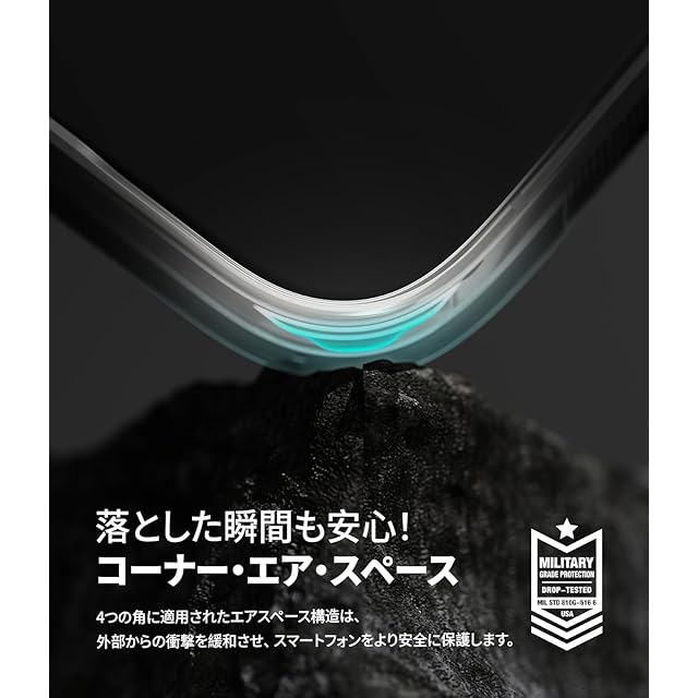 【エアスペース設計】衝撃を吸収する角部分のエアスペース設計とクショニングを考慮した高弾性素材技術でスマートフォンを強力に保護します。