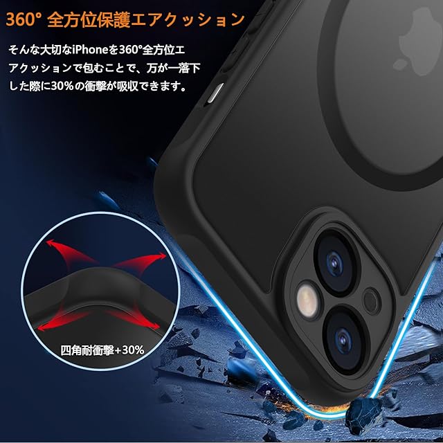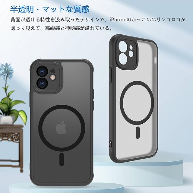 【対応機種】iPhone 専用です。精確にカット加工しているので、ボタンが押しやすく、ポートも使いやすくなっており、機能性に影響しません。<br> 【MagSafe対応・超強磁力】1,900 gの吸着力を備えた強力な内蔵磁石により、吸着力を高めて、安定感をアップしてエネ損失なしの快速ワイヤレス充電できる。様々な状況で安定した状態を保ちます。MagSafeバッテリー、MagSafeカードケース、MagSafeワイヤレス充電器、MagSafeリング、車載スタンドなど様々なMagSafeニーズに対応、Magsafeの便利さを満喫しましょう!<br> 【半透明・マットな質感】背面が透ける特性を汲み取ったデザインで、iPhoneのかっこいいリンゴロゴが薄っり見えて、高級感と神秘感が溢れている。背面のポリカーボネートは耐久性や耐摩耗性に優れ、長く使っても綺麗に見え。スマホに近い感覚を味わうことができ。<br> 【高耐衝撃性・カメラ保護】免震構造である高弾力バンパーと耐震構造である丈夫なポリカーボネート背面で組み合わせて、バランスが良く落下衝撃を本体に伝えにくくなる。隆起エッジにより、スマホを置いた時にスクリーンやカメラが擦れにくくなり、傷から保護することができます。<br> 【スリム・軽量】この握りやすいケースは、厚さたった1.2 cmなので、スマホに近い感覚を味わうことができ、ケースをつけたままコネクタへの接続が可能で。<br> 【品質】iPhone ケースを安心してお使いいただくために、当店は製品に関する品質を提供します。製品に不具合がある場合、注文履歴画面より出品者にご連絡いただき、お問い合わせ内容に応じて、交換などの対応が可能です。<br>