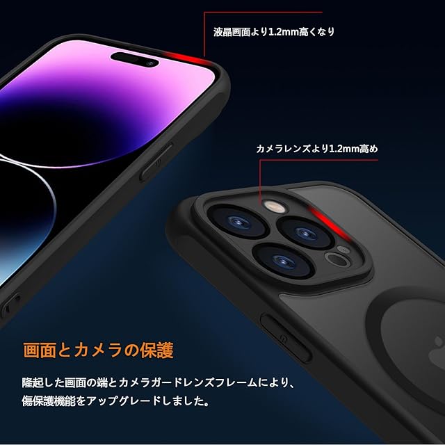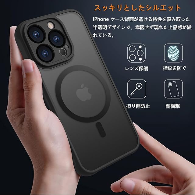 【対応機種】iPhone 専用です。精確にカット加工しているので、ボタンが押しやすく、ポートも使いやすくなっており、機能性に影響しません。<br> 【MagSafe対応・超強磁力】1,900 gの吸着力を備えた強力な内蔵磁石により、吸着力を高めて、安定感をアップしてエネ損失なしの快速ワイヤレス充電できる。様々な状況で安定した状態を保ちます。MagSafeバッテリー、MagSafeカードケース、MagSafeワイヤレス充電器、MagSafeリング、車載スタンドなど様々なMagSafeニーズに対応、Magsafeの便利さを満喫しましょう!<br> 【半透明・マットな質感】背面が透ける特性を汲み取ったデザインで、iPhoneのかっこいいリンゴロゴが薄っり見えて、高級感と神秘感が溢れている。背面のポリカーボネートは耐久性や耐摩耗性に優れ、長く使っても綺麗に見え。スマホに近い感覚を味わうことができ。<br> 【高耐衝撃性・カメラ保護】免震構造である高弾力バンパーと耐震構造である丈夫なポリカーボネート背面で組み合わせて、バランスが良く落下衝撃を本体に伝えにくくなる。隆起エッジにより、スマホを置いた時にスクリーンやカメラが擦れにくくなり、傷から保護することができます。<br> 【スリム・軽量】この握りやすいケースは、厚さたった1.2 cmなので、スマホに近い感覚を味わうことができ、ケースをつけたままコネクタへの接続が可能で。<br> 【品質】iPhone ケースを安心してお使いいただくために、当店は製品に関する品質を提供します。製品に不具合がある場合、注文履歴画面より出品者にご連絡いただき、お問い合わせ内容に応じて、交換などの対応が可能です。<br>