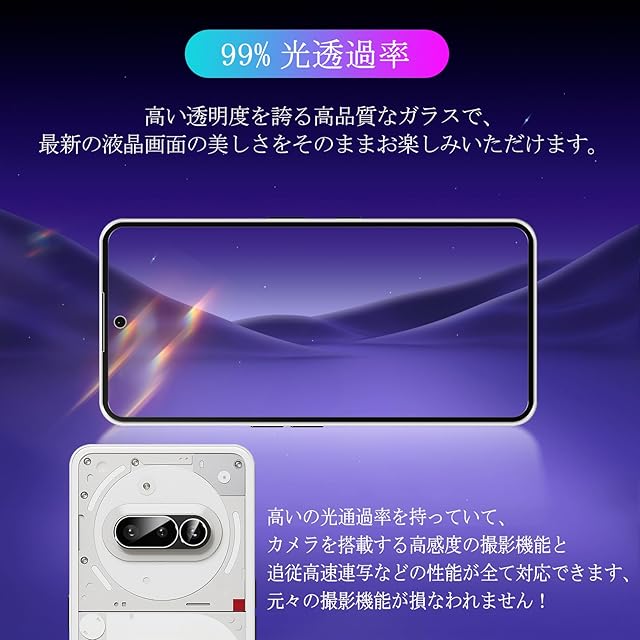 <b>なぜ Tzcizの Nothing Phone 3a フィルム とレンズフィルム を選んだのか?</b><br><br><b>一、上質な製品</b><br><br>【表面強度:9H】<br>日本旭硝子素材を採用、表面強度指数は9Hで、一般的なフィルムの3倍で、で鋭利な物による傷を完璧にブロック。<br><br>【飛散防止】<br>飛散防止加工により、万が一、割れてしまった場合にもほとんどガラス破片が飛び散りづらくて、安心です。<br><br>【ラウンドエッジ加工】<br>ラウンドエッジ加工、手にフィットしやすくて、それに端の部分も浮かべにくいです。<br><br>【気泡防止】<br> フイルム接着面に吸着に優れたシリコンコーティングを施しているので、位置を合わせて上から軽く置くだけで気泡が入ることなく。<br><br>【指紋防止】<br>指紋防止コーティング加工、普通のガラスより指紋が残りにくく。疎水性と抗油性を兼ねていて、水と油脂を画面から簡単に取り除きます。<br><br>【高透過率】<br>透明度が99%以上と高く、フィルムを貼っていても画面の精細さを損ないません、スクリンの鮮明な色を復元します。<br><br>【高感度タッチ感】<br>3Dタッチ対応ためます。高感度のフィードバックで遅延なく、本来のタッチ感で、快適な操作感を実現します。<br><br>【パッケージ内容】<br>Nothing Phone 3A ガラスフィルム【2枚】<br>Nothing Phone 3A レンズ保護フィルム 【2枚】<br>クリーニングキット【2枚】<br>ホコリ除去用ステッカー【2枚】<br><br><br><b>二、良好なアフターサービス </b><br><br>製品には万全を期しておりますが、万が一輸送の過程による落下や衝撃を受けて不具合か初期不良でしたら、遠慮なく連絡してください。 私達は一日中オンラインサービスで皆様に最高のサービスを提供します!<br><br><b>三、Nothing Phone 3A 液晶保護フィルムの貼り付け方法</b><br><br>1.アルコールパッドを使って液晶画面の汚れを拭き取リます。<br>2.ホコリ取りシートを使って、液晶画面に残ったホコリや布繊維を取り除きます。<br>3、フィルムの接着面の保護フィルムを剥がします。コーナーの位置を合わせ、画面上に載せます。コーナー四点を取り付けます、この時点で位置がズレていたら修正します。<br>4、位置が決まったら、液晶画面にそっと置くように手を離す指で押すと一発で綺麗に貼れますが、気泡あるいは浮きが少し出た場合は、クロスを使って気泡を中央から外側に押し出して下さい。<br>注意:貼り直す時、一部のフィルムを剥がすのではなく(フィルムの素材はガラスなので、剥離と貼り付けの力が不均衡、ひび割れや気泡混入、端が浮いてるなどのことが出る可能性があります。)、フィルム全体を剥がすのはポイントです。貼り直しによる浮きを避ける為、剥がす時にフィルムの接着面に触らないように慎重に剝がしてくださいませ。