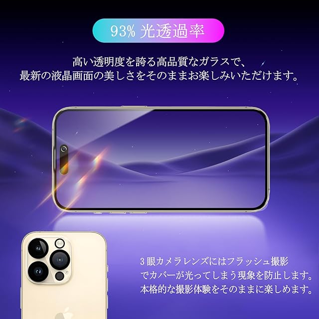 <b>なぜ Tzcizの iPhone14 Pro Max 覗き見防止 フィルム + カメラフィルム + ガイド枠 を選んだのか?</b><br><br><b>一、上質な製品</b><br><br>【覗き見防止】画面を左右から覗かれることを防ぐ180°のプライバシー保護フィルムです。スマホの正面にいるユーザーだけ画面内容をクリアに見えます。<br><br>【表面強度:9H】<br>日本旭硝子素材を採用、表面強度指数は9Hで、一般的なフィルムの3倍で、で鋭利な物による傷を完璧にブロック。<br><br>【飛散防止】<br>飛散防止加工により、万が一、割れてしまった場合にもほとんどガラス破片が飛び散りづらくて、安心です。<br><br>【ラウンドエッジ加工】<br>ラウンドエッジ加工、手にフィットしやすくて、それに端の部分も浮かべにくいです。<br><br>【気泡防止】<br> フイルム接着面に吸着に優れたシリコンコーティングを施しているので、位置を合わせて上から軽く置くだけで気泡が入ることなく。<br><br>【指紋防止】<br>指紋防止コーティング加工、普通のガラスより指紋が残りにくく。疎水性と抗油性を兼ねていて、水と油脂を画面から簡単に取り除きます。<br><br>【高透過率】<br>透明度が93%以上と高く、フィルムを貼っていても画面の精細さを損ないません、スクリンの鮮明な色を復元します。<br><br>【高感度タッチ感】<br>3Dタッチ対応ためます。高感度のフィードバックで遅延なく、本来のタッチ感で、快適な操作感を実現します。<br><br>【パッケージ内容】<br>iPhone14 Pro Max ガラスフィルム【2枚】<br>iPhone14 Pro Max レンズフィルム【2枚】<br>ガイド枠【1枚】<br>スクリーンクリーニングキット【2枚】<br>ホコリ除去用ステッカー【2枚】<br>取扱説明書【1枚】<br><br><br><b>二、良好なアフターサービス </b><br><br>製品には万全を期しておりますが、万が一輸送の過程による落下や衝撃を受けて不具合か初期不良でしたら、遠慮なく連絡してください。 私達は一日中オンラインサービスで皆様に最高のサービスを提供します!<br><br><b>三、貼り付け方法</b><br><br>1.クリーニングキットを使って液晶画面の汚れを拭き取リます。<br>2.ホコリ取りシートを使って、液晶画面に残ったホコリや布繊維を取り除きます。<br>3、フィルムの接着面の保護フィルムを剥がします。コーナーの位置を合わせ、画面上に載せます。コーナー四点を取り付けます、この時点で位置がズレていたら修正します。<br>4、位置が決まったら、液晶画面にそっと置くように手を離す指で押すと一発で綺麗に貼れますが、気泡あるいは浮きが少し出た場合は、クロスを使って気泡を中央から外側に押し出して下さい。<br>注意:貼り直す時、一部のフィルムを剥がすのではなく(フィルムの素材はガラスなので、剥離と貼り付けの力が不均衡、ひび割れや気泡混入、端が浮いてるなどのことが出る可能性があります。)、フィルム全体を剥がすのはポイントです。貼り直しによる浮きを避ける為、剥がす時にフィルムの接着面に触らないように慎重に剝がしてくださいませ。