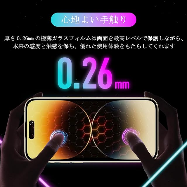 ☺☞【極薄・クリア・感度が高い】アイホン14 pro max 保護フィルムは、通常の液晶保護フィルムよりも高級なガラスを採用して作られており、高精細で透明な保護フィルムが最高な解像度があることを確保し、透明度も高くて93%に達し、高透明度で高精細な見る体験を現実しました。そして厚さが0.26mmの極薄強化ガラススクリーンプロテクターは最高レベルで画面保護を実施しながら、本来の感度と触感を保持して、優れた使用体験をもたらします。