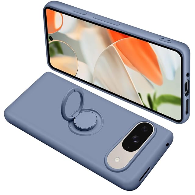 Google Pixel9 ケース Pixel9Pro カバー リング付き シリコン 耐衝撃 グーグル ピクセル 9 リング カバー 液体シリコーン スマホケース 360°回転 スタンド機能 車載ホルダー ストラップホール付き 滑り止め 落下防止(グレーブルー)