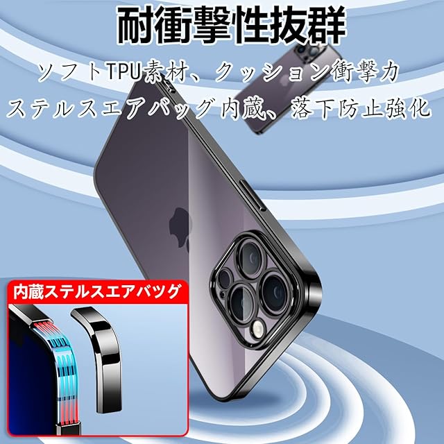 商品名:iPhone 14 Pro Max ケース クリア 耐衝撃 透明 アイフォン14 Pro Max カバー メッキ加工 完全な保護 黄変防止 落下防止 ファッション 薄型 軽量 TPU 柔らかい ワイヤレス充電 人気 保護カバー(ブラック)