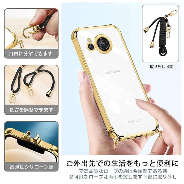 weiaoluo Sharp Aquos R8 ケース ショルダー クリア 薄型 軽量 SH-52D スマホケース Aquos R8 カバー 耐衝撃 薄型 TPU 軽量 肩がけ 首掛け 紐付きバンパー カバー ストラップ付き ストラップホール付き 韓国 透明 ストラップ着脱可 調節 Qi充電 ワイヤレス充電 傷防止 全面(ゴールド)