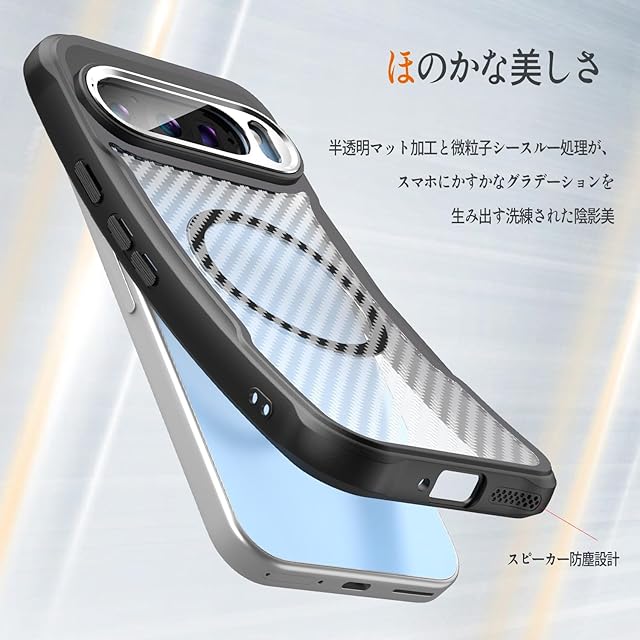 【設計】本製品は背面に高級感あふれるカーボン調テクスチャーと黄変防止コーティングを採用し、スピーカー部分に防塵設計を採用し、ホコリの侵入をブロックします。半透明バックパネルのマット質感は、Pixel本来の美しさを再現しながらも神秘感に溢れています。全カラーのPixelに調和するスタイリッシュなデザインで、ストラップホール付きで携帯性も抜群。