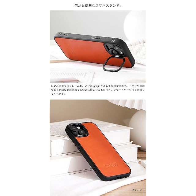 商品名:栃木レザー 本革 スマホケース iPhone 14 互換性 MagSafe 対応ケース スマホスタンド ストラップ (オレンジ)