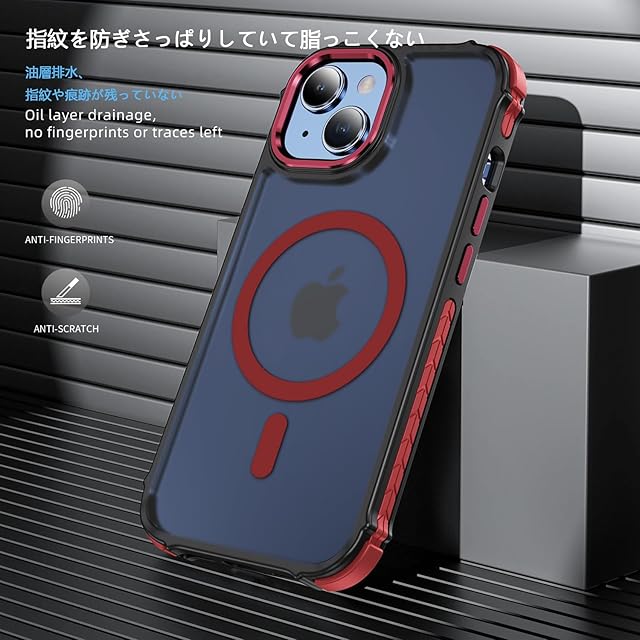 iphone 14 ケース スマホカバー マット半透明 マグネット搭載 ワイヤレス充電 耐衝撃 指紋防止 滑り止め 米軍MIL規格・Magsafe対応 アイフォン 14用カバー インチ PinLiSheng (レッド, iphone 14)