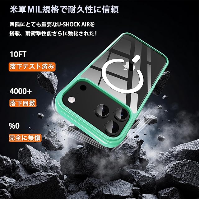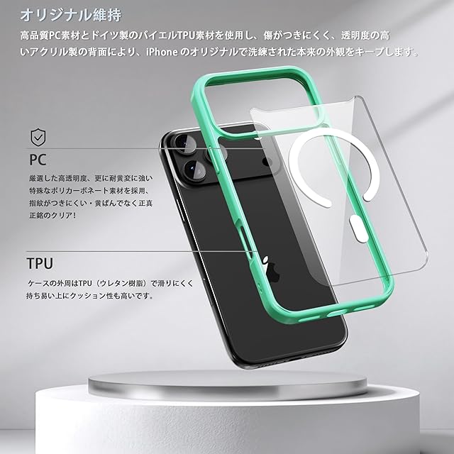 商品名:Iphone 17 PRO ケース スマホカバー マグネット搭載 ワイヤレス充電 耐衝撃 指紋防止 滑り止め 米軍MIL規格・Magsafe対応 アイフォン17 PRO用カバー インチ PinLiSheng (クリアグリーン, Iphone 17 PRO)