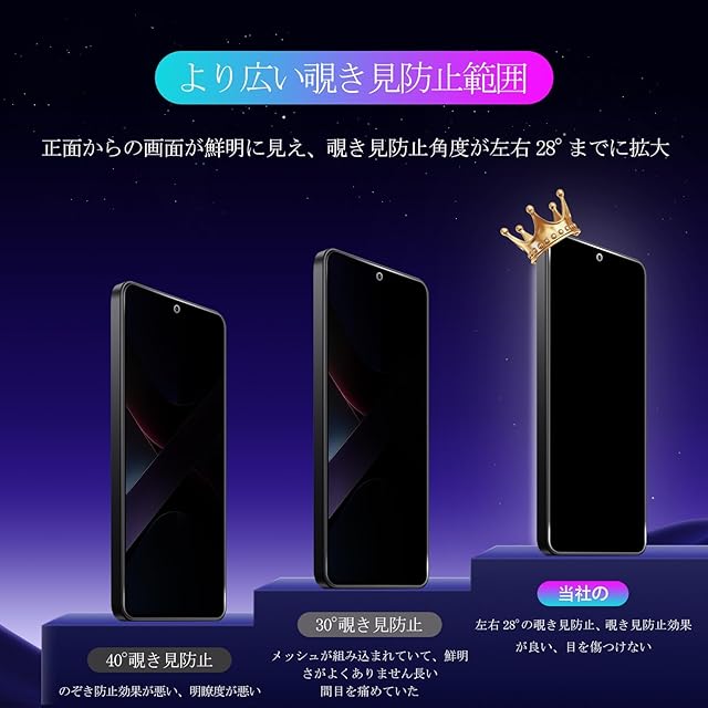 ☺☞【覗き見防止】画面を左右から覗かれることを防ぐ180° 左右 2方向ブラインド仕様のプライバシー保護フィルムです。スマホの正面にいるユーザーだけ画面内容をクリアに見えます。周りの視線を気にすることなくLINEやメールのやりとりを行えます、個人情報も完璧守られます。(ご注意:覗き見防止加工の特性上、画面輝度が多少下がることがありますので、気になる方はデバイスの画面輝度を上げることを勧めます。)