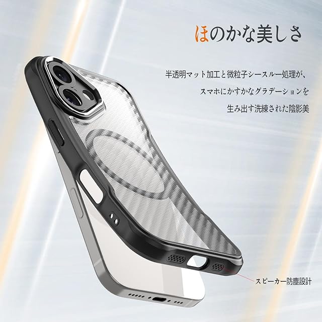 【設計】本製品は背面に高級感あふれるカーボン調テクスチャーと黄変防止コーティングを採用し、スピーカー部分に防塵設計を採用し、ホコリの侵入をブロックします。半透明バックパネルのマット質感は、iPhone本来の美しさを再現しながらも神秘感に溢れています。全カラーのiPhoneに調和するスタイリッシュなデザインで、ストラップホール付きで携帯性も抜群。