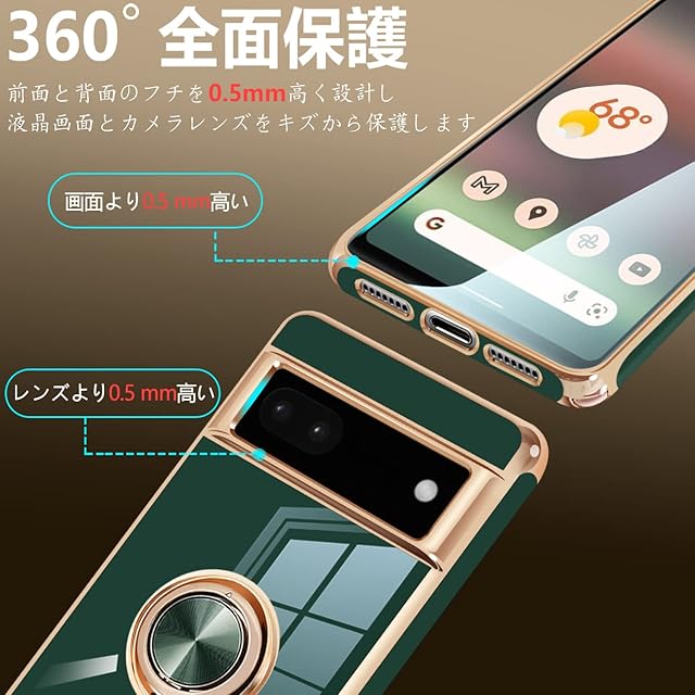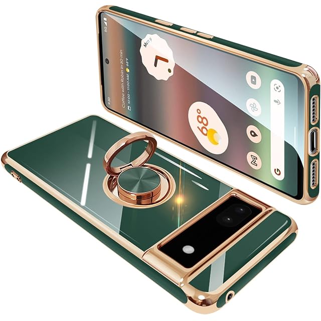 商品名:Google Pixel6A ケース リング付き グーグル ピクセル 6A リング カバー 耐衝撃 TPU メッキ加工 360°回転 スタンド機能 車載ホルダー ストラップホール付き(ダークグリーン)