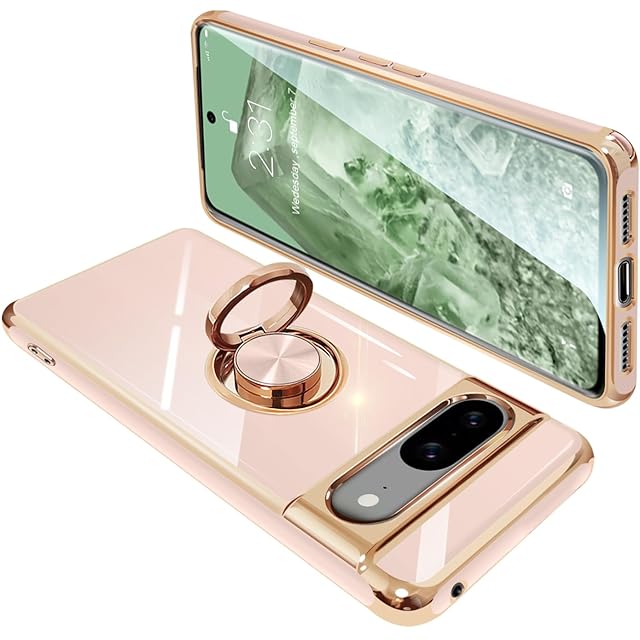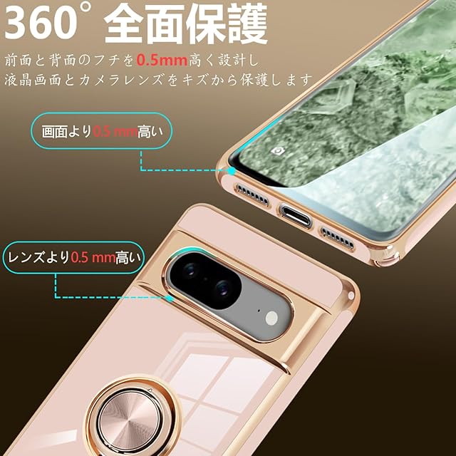 Google Pixel8 ケース リング付き グーグル ピクセル 8 リング カバー 耐衝撃 TPU メッキ加工 360°回転 スタンド機能 車載ホルダー ストラップホール付き(ピンク)