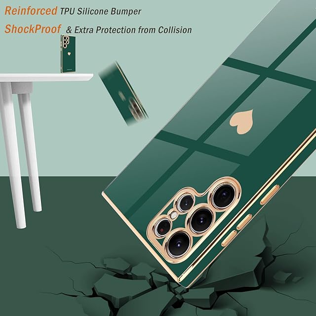Teageo 適用 Samsung Galaxy S22 Ultra ケース対応 少女の 可愛い 愛心の形 メッキ加工保護ケース 薄型 TPU ワイヤレス充電対応 傷に強い 耐衝撃 落下防止 電話カバー Samsung Galaxy S22 Ultra 用 スマホケース(ダークグリーン)