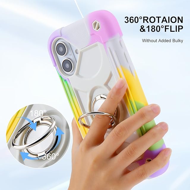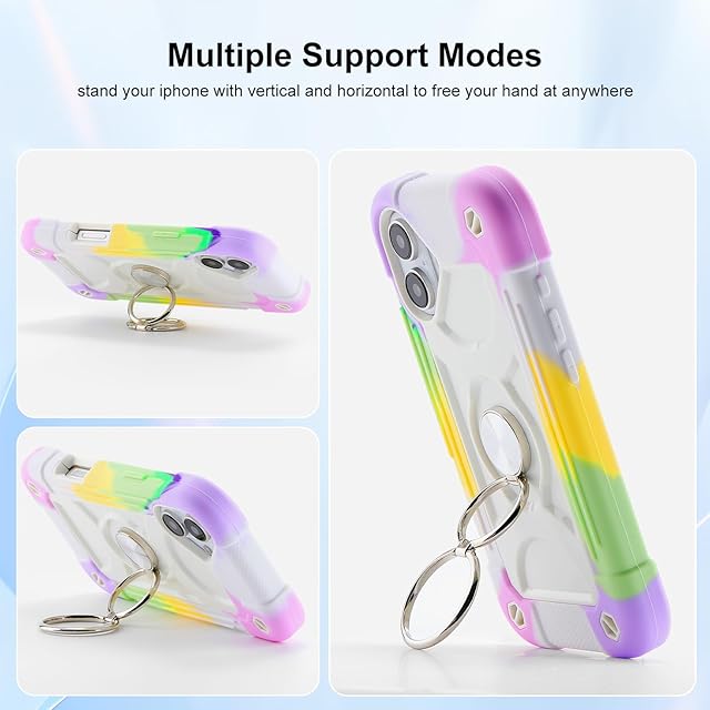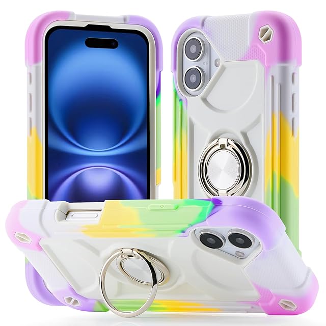 商品名:PboyiqiS For iPhone 16 ケース 耐衝撃 頑丈 360度回転スタンド リング付き付き 虹色 かわいい アイフォン16 マックス ケース 車載ホルダー対応 落下防止 ストラップホール付き アウトドア 子供 仕事用 (虹色紫, iPhone 16)
